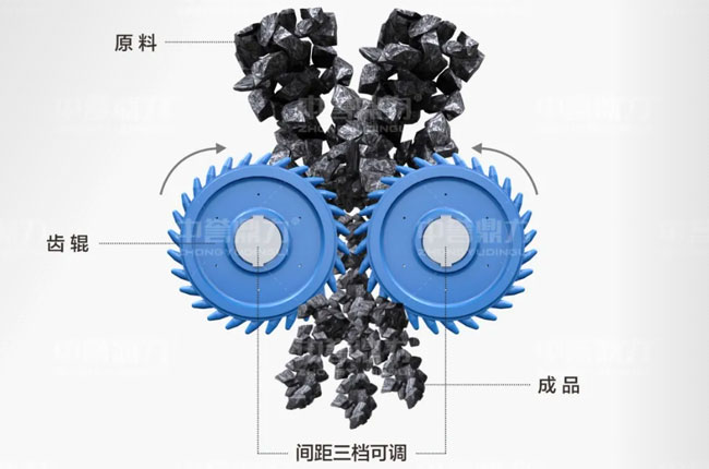 雙齒輥破碎機在工作時,物料進入破碎腔,通過高速旋轉(zhuǎn)兩齒輥對物料進行剪切、擠壓、拉伸等作用對物料進行破碎,齒輥中心距三擋可調(diào),保障出料粒度。