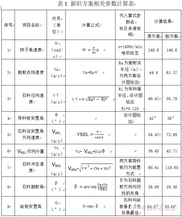 新舊方案的參數(shù)變化,導(dǎo)致了石料沖擊速度VRES和拋射角β的不同。為獲得佳的碰撞破碎效果,布置在機身腔壁的砧板的安置角α相應(yīng)作調(diào)整。兩個方案相關(guān)參數(shù)的計算過程見表1。