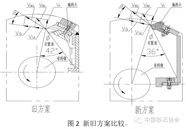 在轉(zhuǎn)速、葉輪直徑、布料錐大小不變的前提下,著眼于盡可能增大拋射點的半徑Ra,適當調(diào)整導(dǎo)料安置角φ,提出了改進方案。新舊方案拋料頭的布置見圖2。