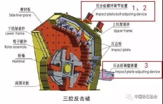調(diào)整反擊架與轉(zhuǎn)子架之間的間隙可達(dá)到改變物料出料粒度和形狀的目的。、二反擊板通過頂部螺桿調(diào)節(jié)裝置,若存在第三塊反擊板(歐版反擊破),則通過墊片調(diào)節(jié)。