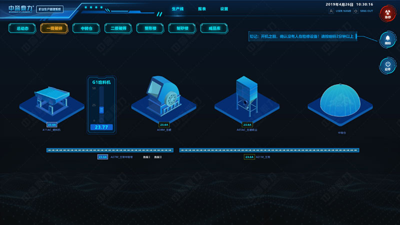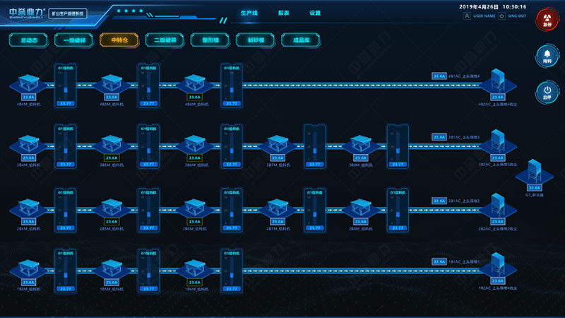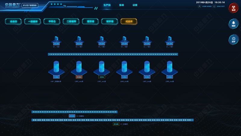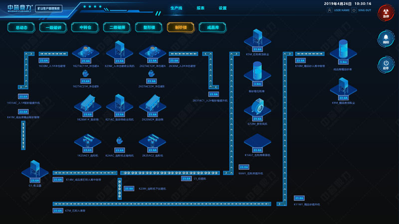 礦山生產(chǎn)管理系統(tǒng)三維形式展現(xiàn)整個生產(chǎn)線,可遠程控制砂石骨料線的給料機、破碎機、皮帶機、制砂機、振動篩等各設(shè)備的啟停,通過傳感裝置感知設(shè)備運行狀態(tài)(如設(shè)備溫度、電壓、電流、振頻等數(shù)據(jù)),可監(jiān)測生產(chǎn)線產(chǎn)量、各儲料倉料位高度等信息,自動生成報表,實現(xiàn)礦山生產(chǎn)環(huán)節(jié)的智能化操控管理及生產(chǎn)決策。