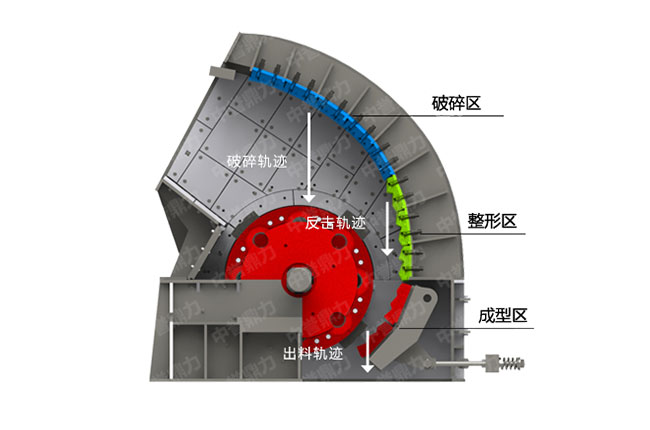 通過電動(dòng)機(jī)帶動(dòng)轉(zhuǎn)子的高速旋轉(zhuǎn),由于轉(zhuǎn)子的高速旋轉(zhuǎn),當(dāng)物料進(jìn)入板錘作業(yè)區(qū)時(shí),受到錘頭的沖擊、碰撞、剪切等作用而破碎,已破碎的石料被拋到反擊裝置上得到再次破碎,之后被彈回板錘作用區(qū)重新破碎,石料經(jīng)過多次反復(fù)破碎直至合格被排出。
