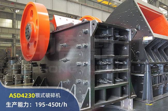 ASD4230顎式破碎機(jī)進(jìn)料粒度500mm左右,出料可達(dá)65mm,時(shí)產(chǎn)量195-450噸。