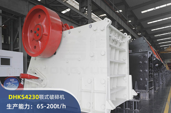 DHKS4230顎式破碎機(jī)進(jìn)料口尺寸1060×750mm,進(jìn)料粒度640mm,出料大小65-200mm,電機(jī)功率110kw,時產(chǎn)量200噸。
