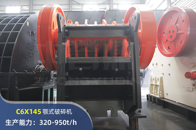 C6X145顎式破碎機進料口尺寸1100×1450mm,進料粒度≤1100mm,出料大小≤125mm,電機功率200kw,時產(chǎn)在320-950噸左右。