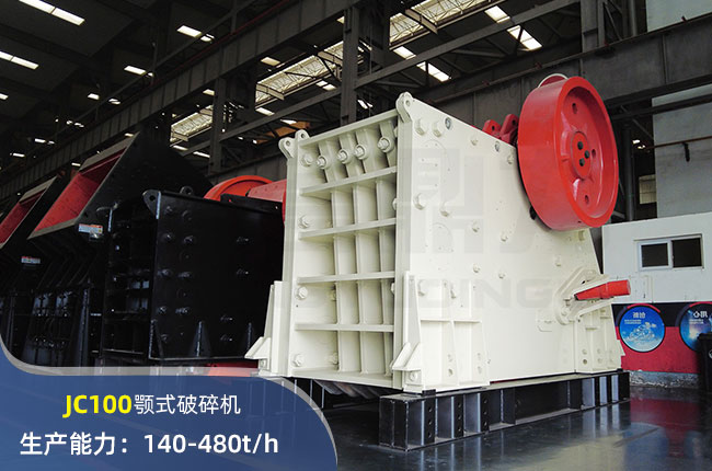 JC100顎式破碎機(jī)進(jìn)料口尺寸1000×760mm,進(jìn)料粒度≤640mm,出料大小≤70mm,電機(jī)功率110kw,時產(chǎn)量480噸左右。