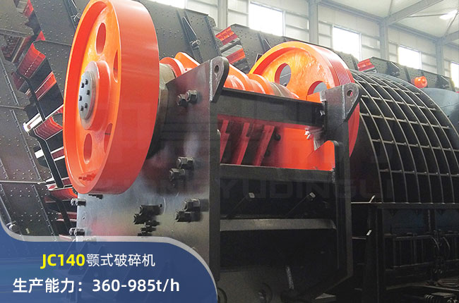 JC140顎式破碎機 進料口尺寸在1400×1070mm,進料粒度≤910mm,出料大小≤125mm,電機功率200kw,時產(chǎn)量在985噸左右。