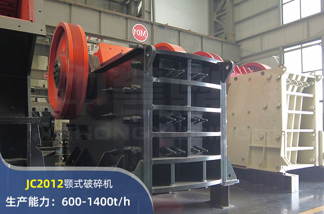 JC2012顎式破碎機進料口尺寸2000×1200mm,進料粒度≤1020mm,出料大小≤175mm,電機功率355kw,時產量在1400噸左右。