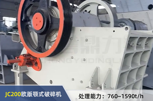 JC200歐版顎式破碎機(jī)給料口寬度是2000mm,給料口深度是1500mm,緊邊排料口可調(diào)整范圍在175-300mm,一小時(shí)處理能力在760-1590噸,配置的電機(jī)功率為400kw,轉(zhuǎn)速是200r/min,破碎機(jī)自重121.51噸。
