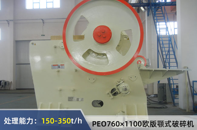 PEO760×1100歐版顎式破碎機進料粒度≤620mm,排料口調(diào)節(jié)范圍75-200mm,時產(chǎn)量150-350噸,配置電動機功率是100-132Kw,機器重量在24噸左右。