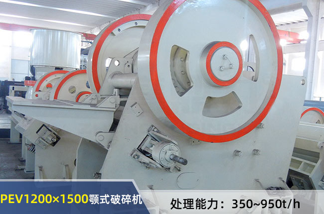PEV1200×1500顎式破碎機(jī)進(jìn)料粒度要求<1020mm,排料調(diào)整范圍180-340mm,時(shí)產(chǎn)能350-950噸之間,配備電機(jī)功率為160-200千瓦,重量為83噸。