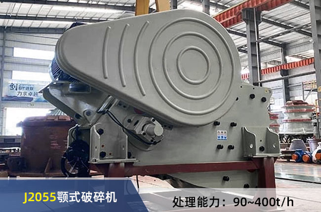 J2055復(fù)擺式顎式破碎機(jī)進(jìn)料口尺寸510×1380mm,進(jìn)料粒度≤400mm,排料口范圍40~130mm,時處理能力90-400噸,采用的是110kw的電機(jī),主機(jī)重為16.5噸。