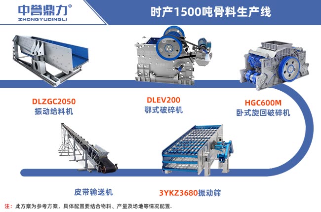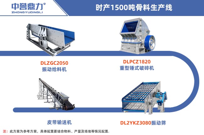 一條時產(chǎn)1500噸的骨料生產(chǎn)線需要用到破碎設(shè)備、給料設(shè)備、振動篩分設(shè)備以及輸送設(shè)備和除塵設(shè)備等,設(shè)備的選擇比較靈活,本金不是很充足的可以選用重錘式破碎機,一破成型。粒度可調(diào),不需要二破設(shè)備,本金充足可以選用鄂破+旋回破的配置方式,下面是兩種不同搭配方法: