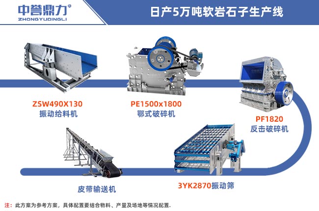 日產(chǎn)5萬(wàn)噸碎石投資方案設(shè)備搭配比較靈活,可以根據(jù)自己的物料屬性、資金狀況進(jìn)行合理選擇,下面以兩種常見(jiàn)的軟巖(石灰石、青石等)處理方案和硬巖(鵝卵石、花崗巖等)處理方案為列: