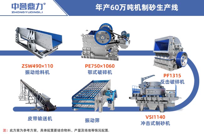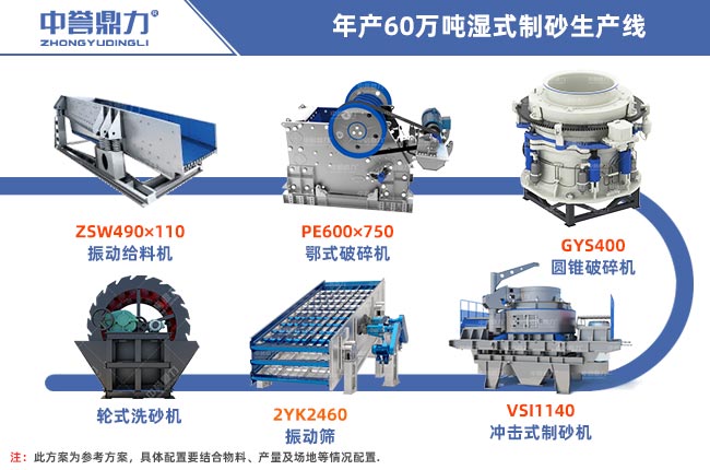 設(shè)備配置:ZSW490×110振動給料機、PE600×750顎式破碎機、GYS400圓錐破碎機、VSI1140制砂機、2YK2460振動篩、XS3020洗砂機、輸送機若干。