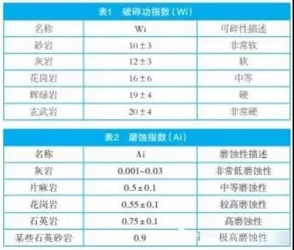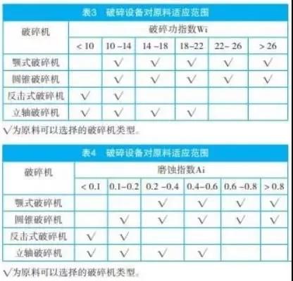 Wi:破碎功指數(shù)——物料破碎的難易程度,Ai:磨蝕指數(shù)——物料對(duì)機(jī)件的磨損程度,常見(jiàn)礦石的Wi和Ai見(jiàn)表1、表2。破碎設(shè)備對(duì)原料的適應(yīng)范圍見(jiàn)表3、表4。