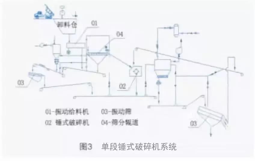 單段錘式破碎機(jī)系統(tǒng)由錘式破碎機(jī)和篩分系統(tǒng)組成見(jiàn)圖3。
