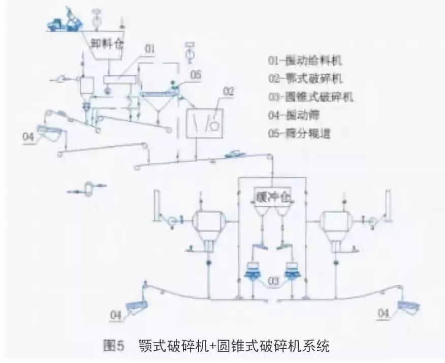 此系統(tǒng)由顎式破碎機(jī)、圓錐式破碎機(jī)和篩分系統(tǒng)組成見(jiàn)圖5。