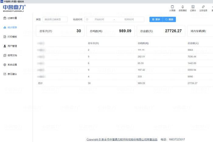 3、統(tǒng)計(jì)報(bào)表,統(tǒng)計(jì)稱重?cái)?shù)據(jù)、車次、可計(jì)算金額;