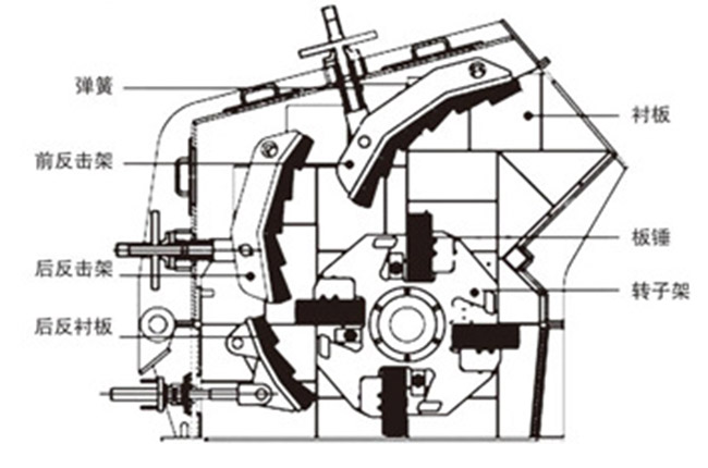 1214反擊破結構由板錘、轉(zhuǎn)子架、襯板、彈簧、反擊架、反擊襯板等組成。