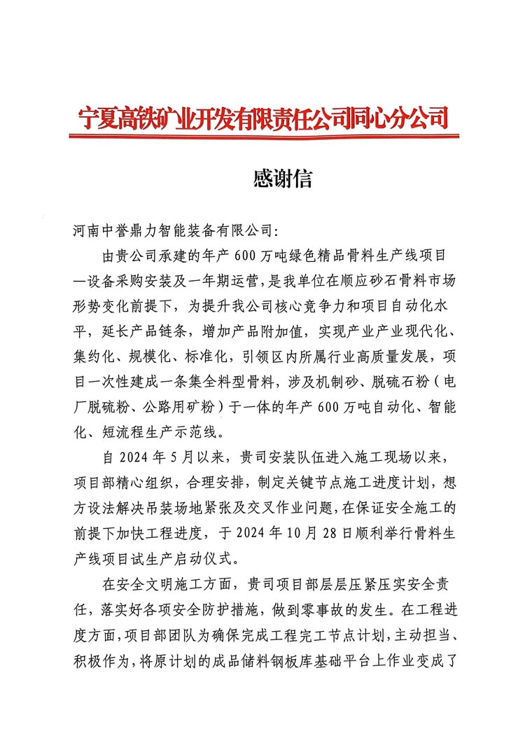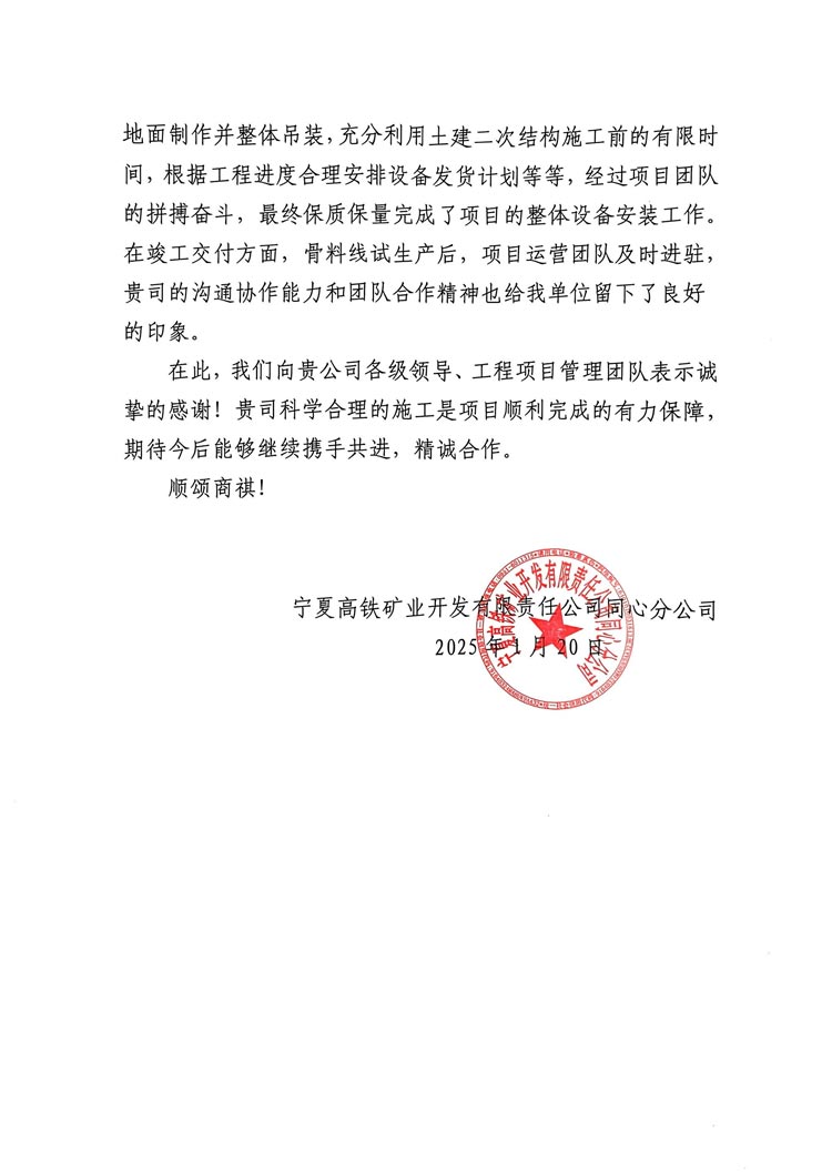 新春前夕,中譽鼎力迎來了一份的新年禮物——寧夏高鐵同心分公司的感謝信和錦旗。感恩客戶對我們過去一年工作的高度認(rèn)可,新的一年,愿與所有客戶及企業(yè)同仁攜手共進(jìn),披荊斬棘,續(xù)寫高質(zhì)量發(fā)展華彩新篇。