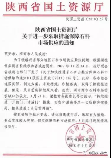 近日,陜西省土資源廳發(fā)布《陜西省土資源廳進(jìn)一步采取措施保障石料市場供應(yīng)的通知》,提到:目前,西安、渭南兩市石料市場需求缺口較大。《通知》要求:西安和渭南要盡所能僵局,迅速行動,采取有力措施,務(wù)實現(xiàn)較大,切實保障石料市場供應(yīng),5月底將進(jìn)展情況報陜西省土資源廳。