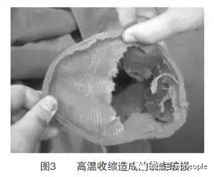 高溫?zé)煔鈱?duì)濾袋的另外一種損害是高溫收縮,雖然每種濾料的使用溫度不同,但當(dāng)煙氣溫度過其使用溫度后,如其經(jīng)向收縮率過大,會(huì)使濾袋在長(zhǎng)度方向上尺寸變短,濾袋袋底緊托著骨架并受力而損壞(如圖3)。如果濾袋緯向熱收縮過大,將使濾袋在徑向尺寸變小,濾袋會(huì)緊緊箍在骨架上,甚至無法抽出骨架。從而使濾袋處于受力狀態(tài),造成濾袋的收縮變形、變硬、變脆,加快強(qiáng)度耗損、減短濾袋壽命。由于濾袋變形后會(huì)緊緊箍在骨架上,在清灰時(shí)濾袋難以變形而不利于噴吹清灰,導(dǎo)致濾袋阻力居高不下。