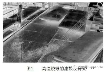 高溫對(duì)濾袋的損害是致命的。如黑龍江某煤粉干燥窯,由于干燥后煤粉顆粒細(xì)小又粘,清灰不理想,使濾袋表面存留大量的干燥后的煤粉,而這種干燥后的煤粉,燃點(diǎn)又低,當(dāng)高溫?zé)煔膺M(jìn)入除塵器后,會(huì)迅速點(diǎn)燃濾袋表面的煤粉,導(dǎo)致整臺(tái)除塵器的濾袋及骨架部被燒毀(如圖1)。從圖1可以看出,濾袋表面殘留大量的干燥后的煤粉,從其左上角也可見箱體被燒毀。