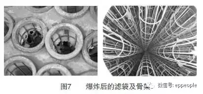 隨著袋式除塵器的普及,袋式除塵器粉塵爆炸事故也呈上升趨勢(shì)。如上海某鋼廠的干熄焦除塵系統(tǒng),由于前部阻火墻制造的問題,造成火星進(jìn)入除塵器內(nèi)從而引起爆炸,將除塵器進(jìn)口管道盲板炸出幾十米遠(yuǎn),除塵器箱體嚴(yán)重變形。又如沈陽(yáng)某機(jī)制炭廠,由于鋸末在炭化過程中產(chǎn)生大量的焦油和碳?xì)浠衔锏纫兹、易爆物質(zhì),而且焦油粘在濾袋上隨著時(shí)間推移越積越多,當(dāng)有火星進(jìn)入除塵器后就引起了除塵器爆炸。除塵器爆炸瞬間所產(chǎn)生的能量可使花板嚴(yán)重變形,濾袋爆裂情況見圖7。