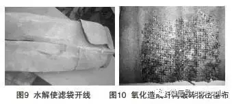纖維氧化是纖維中分子失去(或離解)電子的過程,如PPS纖維,在高溫(150℃)條件下氧分子攻擊分 子中的“S”,并與之結(jié)合。造成PPS纖維變色、變硬、 變脆,強(qiáng)度而破損,嚴(yán)重時(shí)纖網(wǎng)會(huì)破碎而脫離基布 (如圖10)。氧化是濾袋損壞的又一主要因素。抗氧化 性能較差的濾料主要有:聚丙烯、聚苯硫醚(PPS)等。