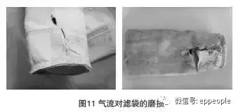 過高的過濾氣速會(huì)使粉塵沖擊、磨損濾袋,也會(huì)使 濾袋的織物纖維張力受損。除塵器的進(jìn)氣分布不均,容 易使高含量的大顆粒粉塵直接沖擊局部濾袋,造成廢氣 進(jìn)口處部分濾袋穿孔(如圖11)。