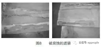 腐蝕是濾袋損壞的常見的原因之一,由于煙氣中含有多種腐蝕性物質(zhì),且在高溫環(huán)境下腐蝕作用更大,從而會(huì)造成濾袋損壞。產(chǎn)生腐蝕的主要原因有水解、氧化、酸、堿腐蝕。其中主要以水解、氧化原因造成損壞較多,而酸腐蝕較少,堿腐蝕則更少。