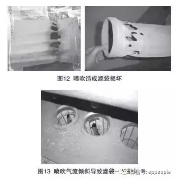 由于噴吹管內(nèi)的氣流為橫向運(yùn)行,當(dāng)導(dǎo)流管設(shè)置不 當(dāng)時(shí),產(chǎn)生的噴吹管氣流就不是垂直而是傾斜向下噴入 濾袋,就會(huì)造成袋口部位下方約300mm處產(chǎn)生由內(nèi)向外 的破損(如圖12、13所示)。