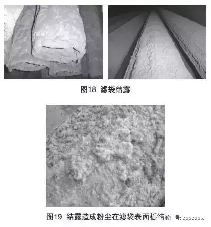 結(jié)露是袋式除塵器運(yùn)行中常見問題(如圖18), 水分是濾袋結(jié)露的大原因,造成濾袋含有水分的原因 通常是低溫發(fā)生凝露,尤其在處理燃燒或高溫?zé)煔鈺r(shí),當(dāng)濾袋表面的初始粉塵層含有水分,干燥后就會(huì)使粉塵 凝結(jié)、板結(jié)(如圖19)。