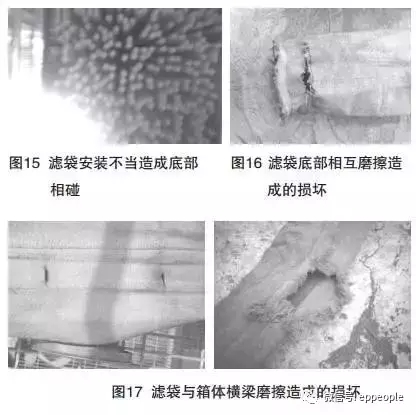 濾袋安裝不良,會(huì)由于花板、骨架等原因不與花板 相垂直(如圖15);如果過于偏斜就會(huì)造成濾袋底部相 互磨擦而損壞(如圖16);濾袋與壁板及濾袋與箱體橫 梁間也會(huì)由于磨擦而造成濾袋損壞(如圖17)。
