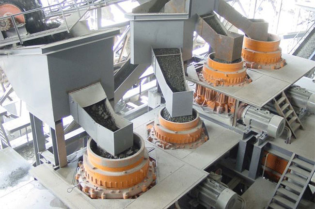 圓錐破設(shè)備的粉碎腔結(jié)構(gòu)中內(nèi)齒板組和外齒板組構(gòu)成了倒錐形的型腔,內(nèi)齒板和外齒板在末端形成了一個開口向外的的平行區(qū),該平行區(qū)的間隔是預(yù)先調(diào)定的,這也限制了排礦粒度,使機械粒度更加均勻,巖石進入倒錐形粉碎腔后,由齒板上上的兩齒定位,齒板上的齒施力對巖石進行彎折和剪切;相同的,齒板和構(gòu)成的級粉碎腔破碎過程與級相似;由齒板和構(gòu)成的第三級粉碎腔主要用做進行整型破碎和排料,這中在倒錐形腔仍然進行彎剪破碎,這與圓錐碎石機的型腔有所不同,根本因素在于碎石原理的不同,傳統(tǒng)的圓錐碎石機主要憑借動錐的偏心擺動將巖石壓向定錐襯板,對巖石出現(xiàn)強大的擠壓影響,使巖石被破碎。