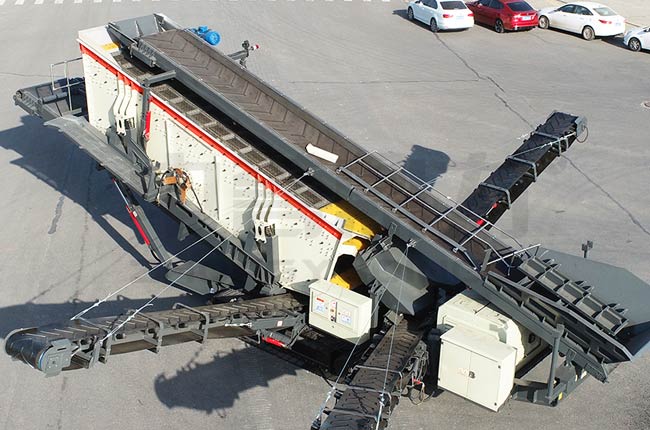 輪胎移動篩分機工作時,上料皮帶機將原料送至篩分機頂部,通過振動篩篩選作業(yè),頭層篩網(wǎng)大顆粒骨料會通過返料皮帶機返回上級破碎機,其他層級篩網(wǎng)篩出的物料從篩機兩側(cè)可用移動皮帶機輸送。