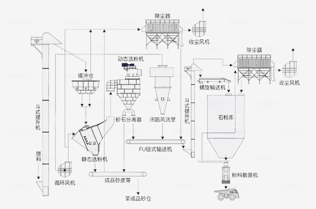 閉路循環(huán)風選:負壓運行,風道管路閉路循環(huán),粉塵無外溢,閉路風選室分離75μm以下石粉