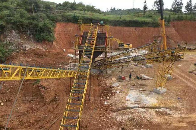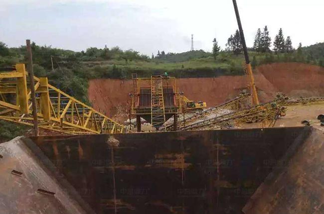 貴州凱里時產(chǎn)300噸石灰?guī)r破碎機(jī)生產(chǎn)線,采用一臺ZG1238給料機(jī)、一臺PCZ1512重錘破碎機(jī)、兩臺3YK1860振動篩和皮帶機(jī),工藝流程簡單,出3種不同規(guī)格的成品骨料。