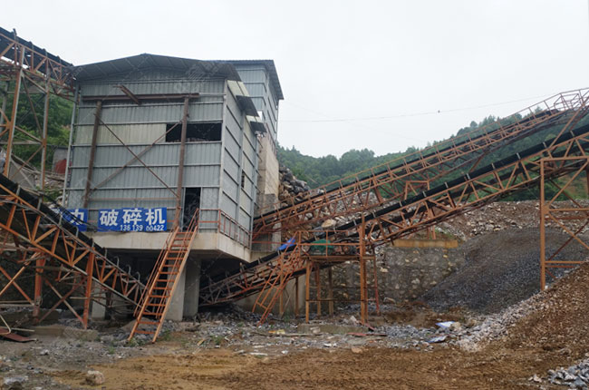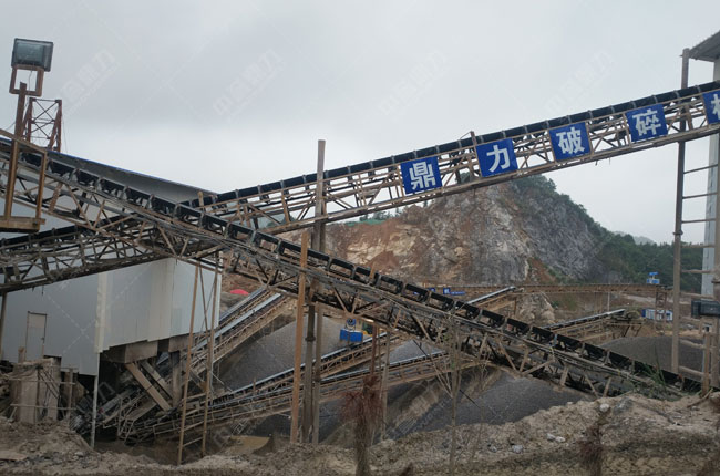 石灰?guī)r原石料經(jīng)1238給料機(jī)送入PCZ1512重錘破進(jìn)行破碎,之后由皮帶機(jī)送入2470輕型振動(dòng)篩篩選,后經(jīng)輸送機(jī)送至不同規(guī)格的成品料堆。