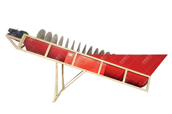 螺旋洗沙機(jī)工作時(shí),電機(jī)通過V型皮帶、減速機(jī)、齒輪減速后驅(qū)動葉輪緩慢操作,砂石有送料槽進(jìn)入洗槽中,在葉輪的驅(qū)動下翻滾,并互相碾磨,除去覆蓋砂石表面的臟東西,此時(shí)傷害包覆砂粒的水汽層,以利于脫水;此時(shí)加水,形成強(qiáng)大水流,立即將臟東西及比重小的異物帶走,并從溢出口洗槽排出,完畢清洗影響,干凈的砂石由葉片帶走,后砂石從操作的葉輪倒入出料槽,完畢砂石的清洗影響。