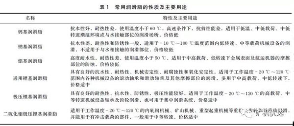 常用的潤(rùn)滑脂有鈣基潤(rùn)滑脂、鈉基潤(rùn)滑脂、鋁基潤(rùn)滑脂、通用鋰基潤(rùn)滑脂、壓鋰基潤(rùn)滑脂和二硫化鉬壓鋰基潤(rùn)滑脂,其特性及主要用途見表1: