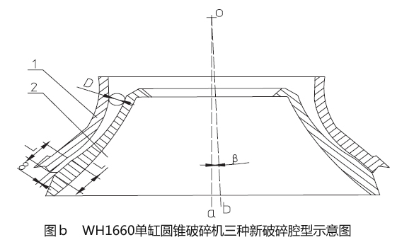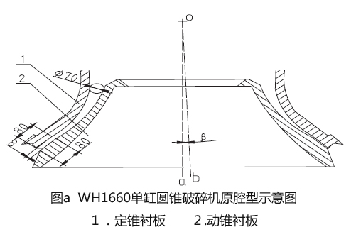 圓錐碎石機(jī)的腔型是決定設(shè)備細(xì)粒級(jí)含量的因素,我們決定對(duì)于WH1660單缸圓錐碎石機(jī)的粉碎型腔進(jìn)行再次設(shè)計(jì),以使該設(shè)備能符合f=12 的平均莫氏硬度巖石的生產(chǎn)要求。
