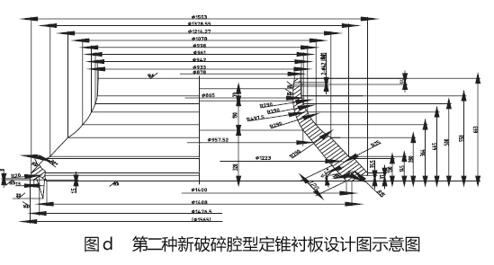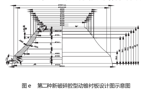 我們生產(chǎn)線設(shè)計(jì)小組用了半個(gè)月的時(shí)間設(shè)了三種新粉碎腔型(如圖b 所示,詳細(xì)數(shù)值見(jiàn)表c)。三種粉碎腔型相應(yīng)的不變襯板及動(dòng)錐襯板的圖紙?jiān)O(shè)計(jì)完畢后,立即投入了生產(chǎn)解決,并在三套新備件回來(lái)后,我們?cè)谶B續(xù)三個(gè)襯板的采用周內(nèi),分別在平均莫氏硬度f(wàn)=12 的鐵巖石整型破碎生產(chǎn)中試用了這三種腔型,在生產(chǎn)平均莫氏硬度f(wàn)=12 的鐵巖石整型破碎生產(chǎn)時(shí),由于粉碎腔型中平行粉碎帶斜長(zhǎng)的增加,整型破碎效果越來(lái)越好,但過(guò)分增加,勢(shì)會(huì)引起整型破碎加工能力的指標(biāo)要求。結(jié)合三種新式腔的采用效果,我們終采用了種型腔,與它相連的不變襯板及動(dòng)錐襯板的效果圖分別如圖d、圖e 所示。