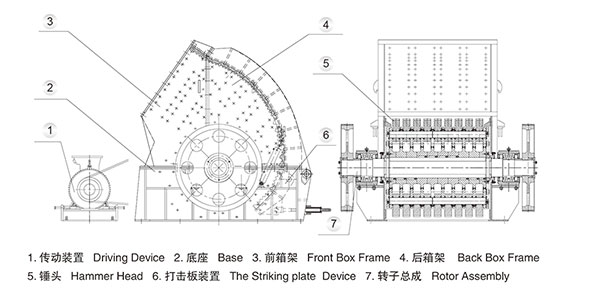 錘式礦山碎石機(jī)在工作時(shí),電機(jī)驅(qū)動轉(zhuǎn)子在機(jī)腔內(nèi)高速操作,石頭自頂部送料口給入機(jī)內(nèi),受高速運(yùn)動的錘子的撞擊、沖擊、剪切、碾磨影響而粉碎,在轉(zhuǎn)子底部,裝有蓖條、粉碎石頭中小于篩網(wǎng)目數(shù)的粒級 通過蓖條排出,過篩網(wǎng)目數(shù)的粗粒級 阻留在蓖條上繼續(xù)獲得錘子的撞擊和碾磨, 再通過蓖條排出機(jī)外。