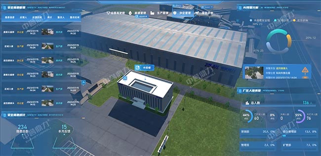 大屏實(shí)景三維展現(xiàn)整個(gè)廠區(qū),集生產(chǎn)、環(huán)保監(jiān)測(cè)、視頻監(jiān)控、礦山設(shè)備等數(shù)據(jù)進(jìn)行綜合監(jiān)測(cè)分析,對(duì)各類異常事件進(jìn)行可視化預(yù)警,提升了礦山管理方面的能力和水平,促使管理者對(duì)砂石廠管理變得更加快捷高效、安全有序。