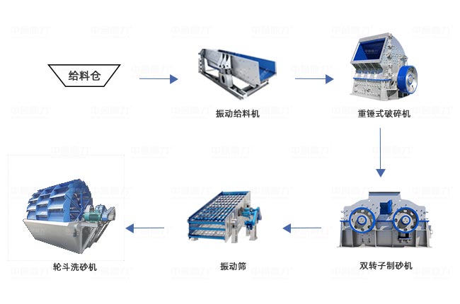 設(shè)備配置:原料倉、ZGC0938振動(dòng)給料機(jī)、PCZ1308重型錘式破碎機(jī)、ZSJ1213雙轉(zhuǎn)子制砂機(jī)、2470振動(dòng)篩、3020輪式洗砂機(jī)、輸送機(jī)