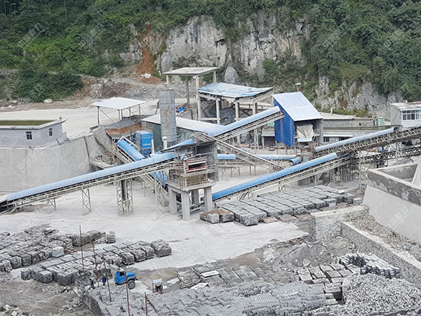 花崗巖原料經(jīng)振動給料機均勻給料,進入液壓顎式破碎機進行粗破,然后進入液壓圓錐破碎機進行二破,二破出來的石料用振動篩進行篩分,返料進入二破,小于150mm成品料進入另外的液壓圓錐破碎機進行三段破碎,大于40mm進入液壓圓錐破碎機再次破碎,小于40mm的進入沖擊式破碎機整形,成品出0-5mm,5-10mm,10-20mm,20-31.5mm的骨料,該生產(chǎn)線產(chǎn)量大、粒型好。